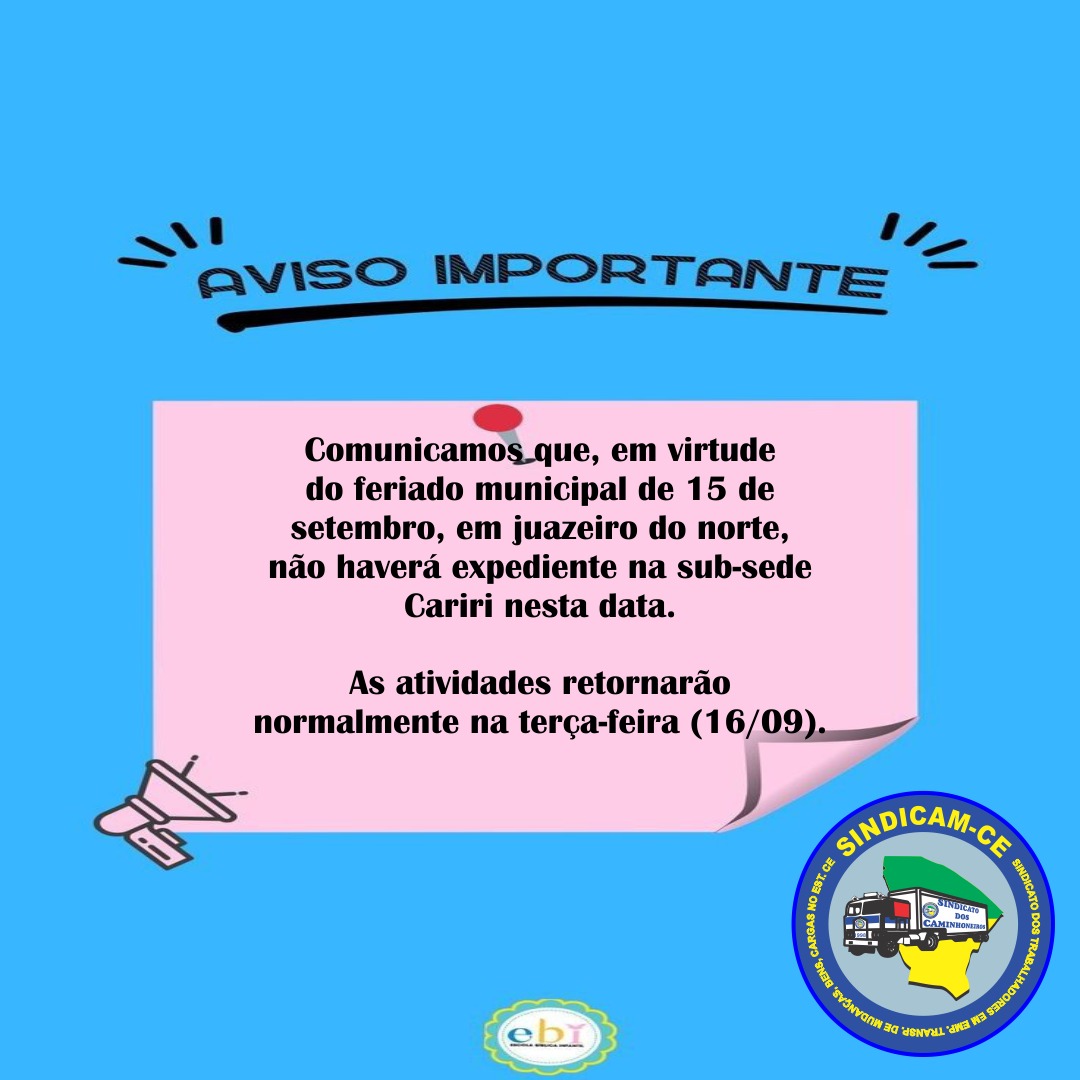 Comunicamos que, em virtude do feriado municipal de 15 de setembro, em Juazeiro do Norte, não haverá expediente na sub-sede Cariri nesta data.