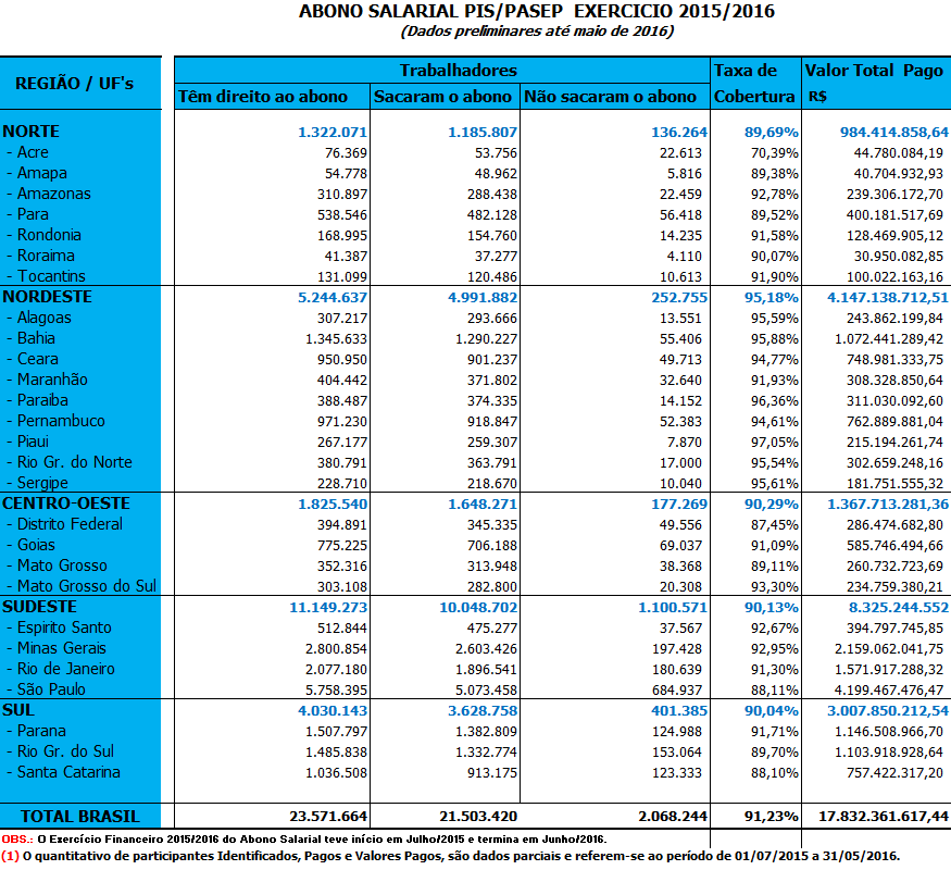 Números – em todo o Brasil foram identificados 23,6 milhões de trabalhadores com direito a receber o abono salarial de 2015. Desse total, 21,5 milhões já fizeram os saques. Os dois milhões que ainda não acessaram o recurso representam 8,7%. O valor não sacado soma R$ 1,7 bilhão.