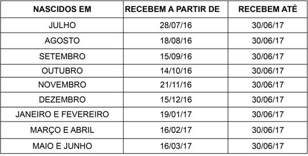 Desde o dia 28, começou a ser pago o abono salarial do ano-base 2015. De acordo com o calendário, quem nasceu de julho a dezembro, recebe o benefício neste ano (2016) e os nascidos entre janeiro e junho, recebem no primeiro trimestre de 2017. Em qualquer situação, o recurso ficará à disposição do trabalhador até 30 de junho de 2017, prazo final para o recebimento.